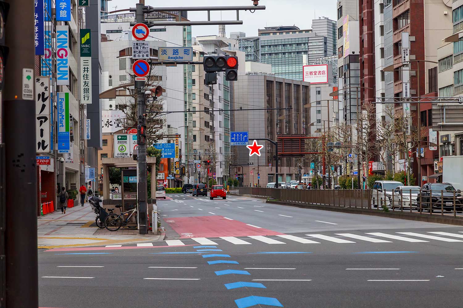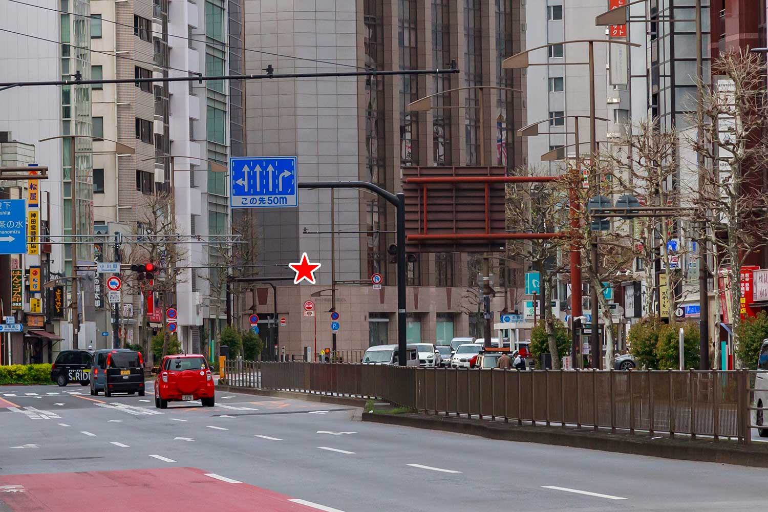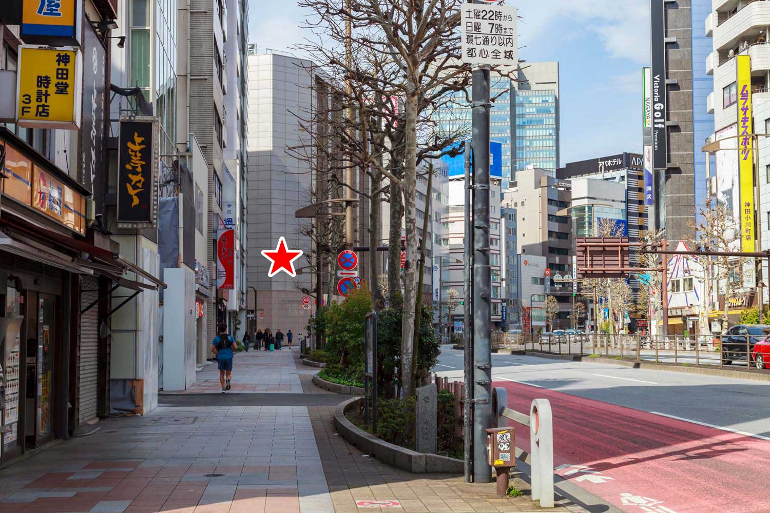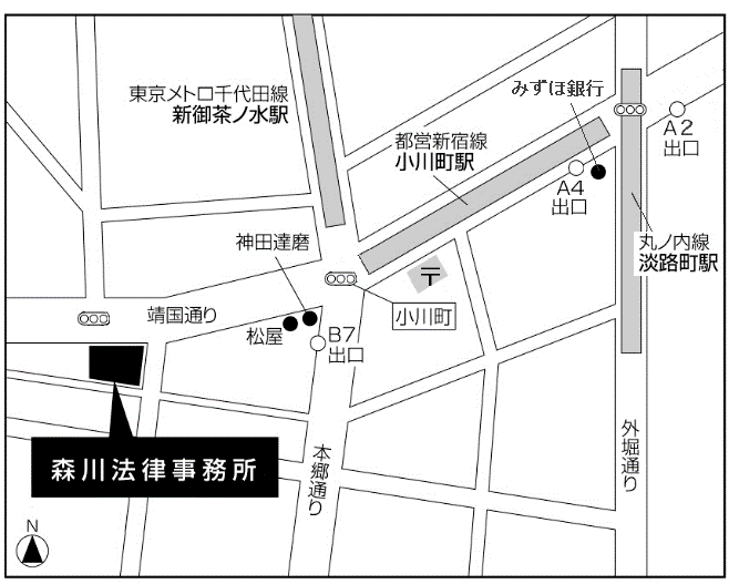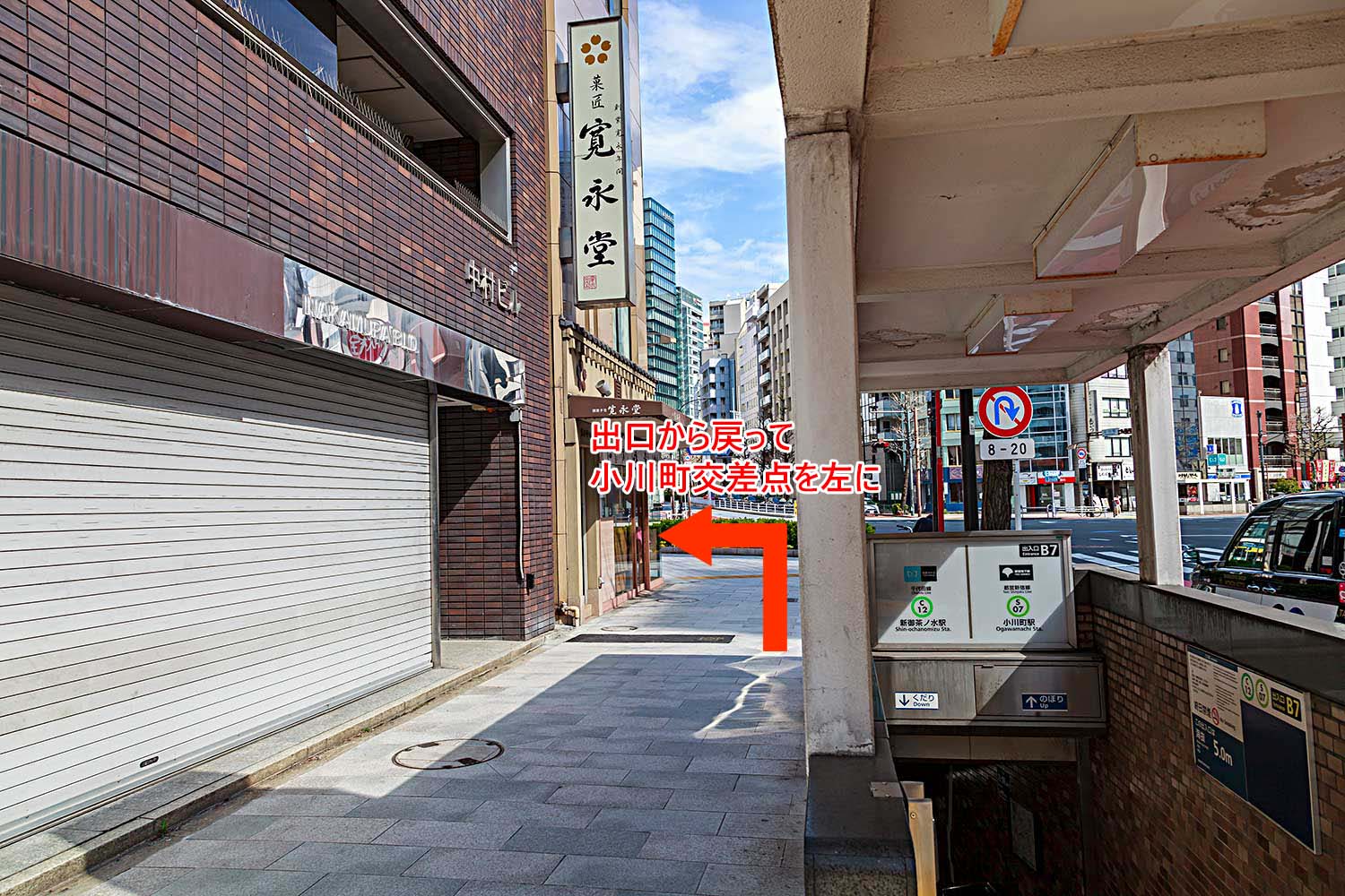 B7出口から出て後ろを振り返ると、小川町交差点があります。小川町交差点まで行って左方向に進み、たい焼き屋「神田達磨」、松屋、薬の福太郎などの前を通って約2分(150m)で、当事務所の入るビルに到着します。ビル入り口は、ビル手前の脇道(左手方向)に入ってすぐです。